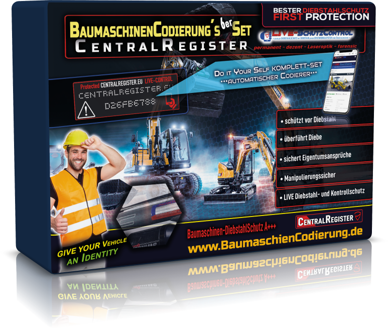 IDENTIFY-SYSTEM | CentralRegister.eu bieten ihnen für ihr Baufahrzeug einen hochgradig wirksamen Schutz gegen nationale und internationale Diebe,